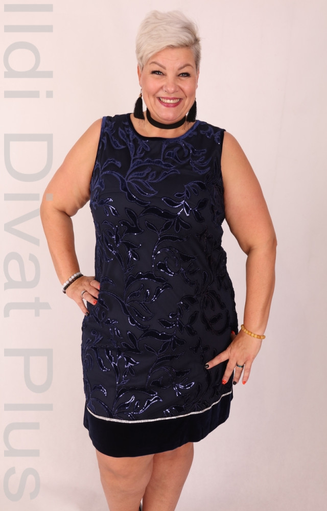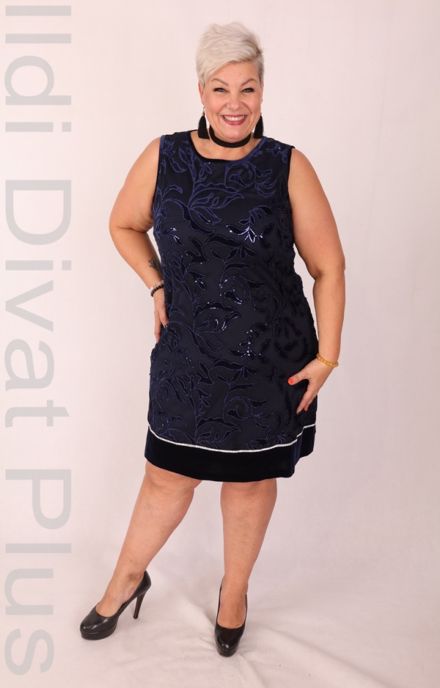Frank Lyman sötétkék színű, flitter és csipke díszítésű, karcsúsított fazonú ruha.