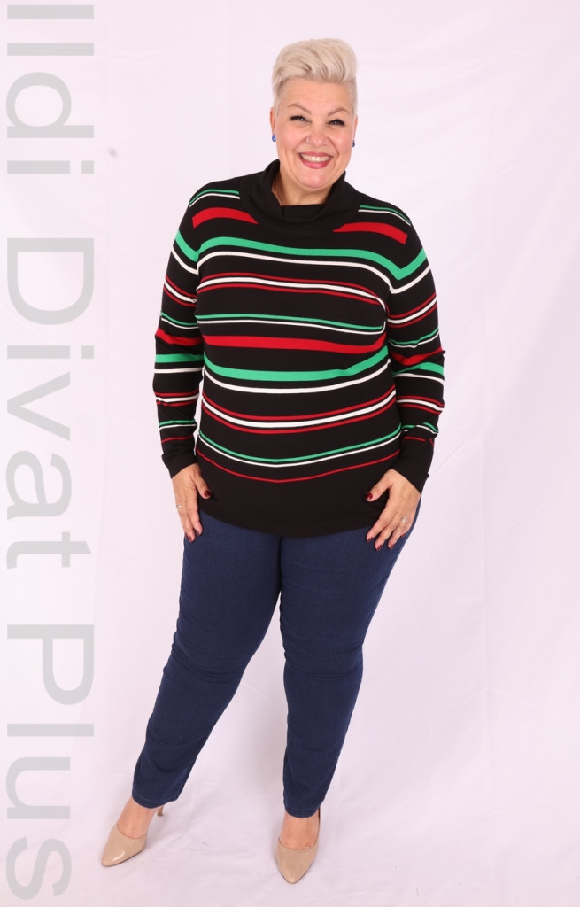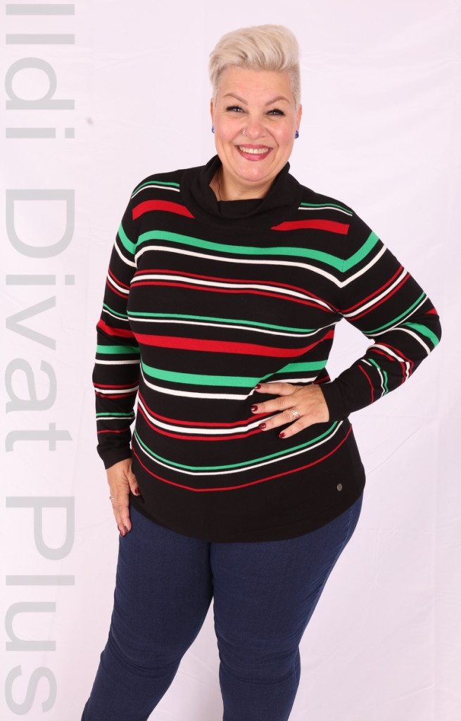Joy Of Life piros-zöld csíkos kámzsás nyakú kötött pulóver.