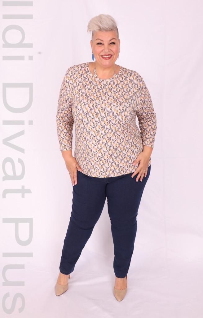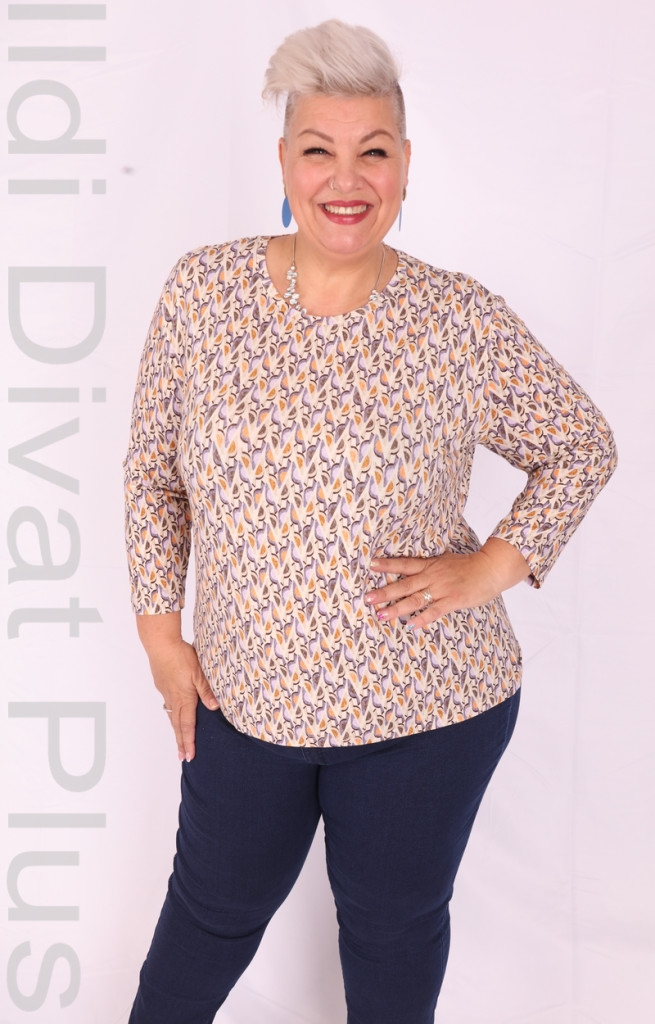 Joy Of Life beige-lila mintás kerek nyakú hosszú ujjú felső.