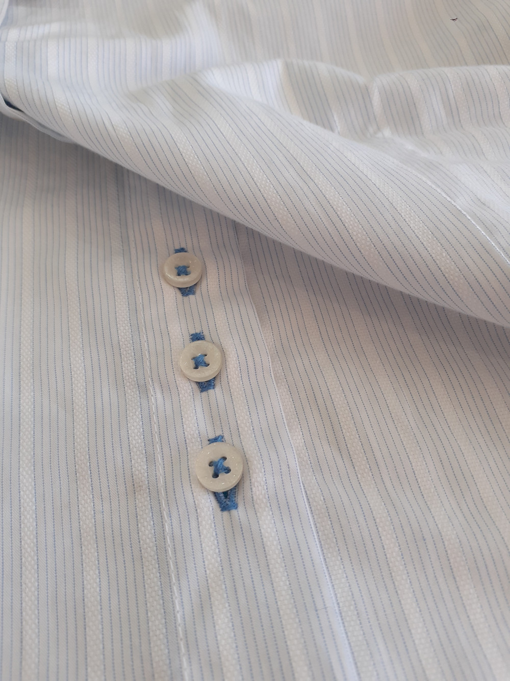 Konstantin fehér és világoskék csíkos, dupla galléros, felhajtható mandzsettás, karcsúsított fazonú ing.