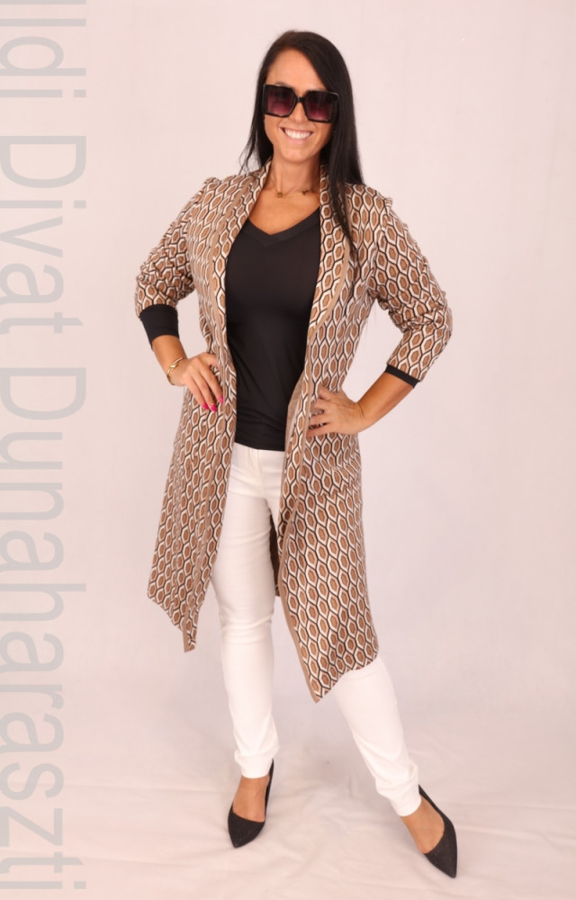 La vita barna-fekete-drapp méhsejt mintás, gépi kötött anyagú, galléros, zsebes, egyenes fazonú, hosszított kardigán.