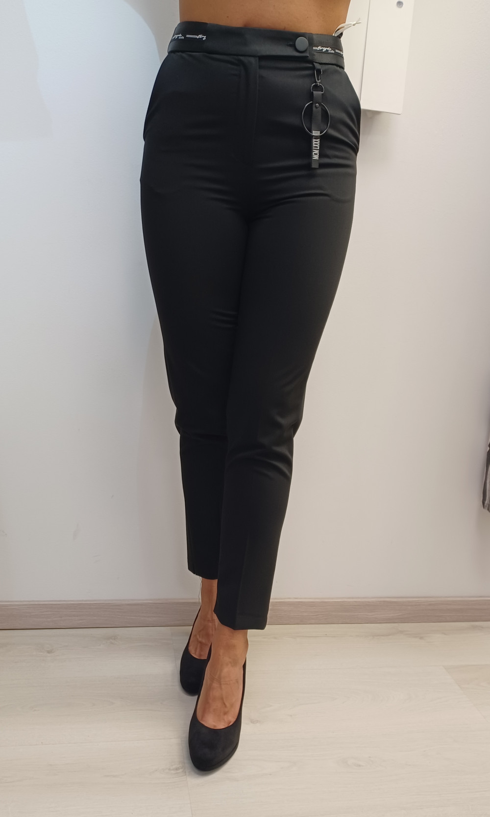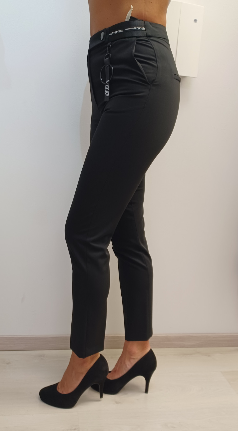 Limitált kollekciós, fekete színű, derekán díszbetétes, elején zsebes, hátul díszzsebes, élére vasalt, magasított derekú nadrág.