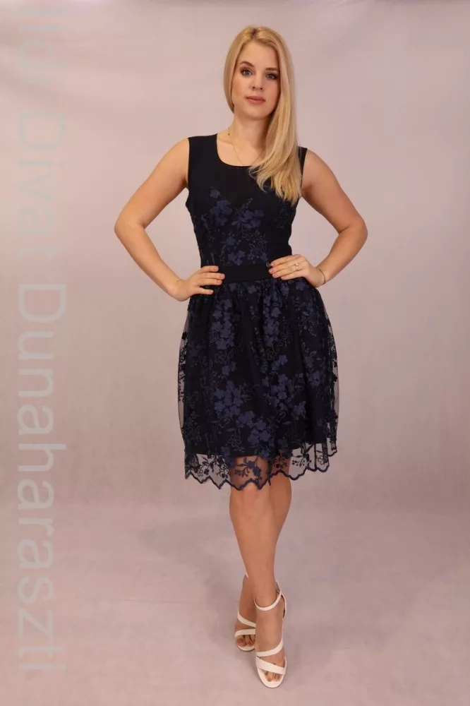 Mystic Day sötétkék csipkés, vállán necces, A-vonalú ruha.