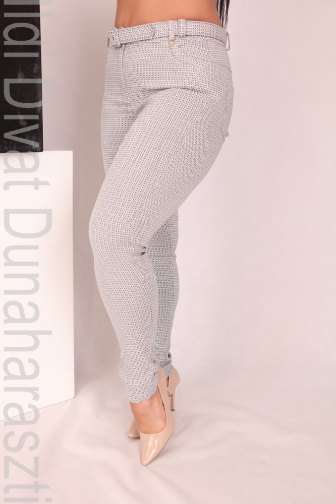 Mystic Day fehér alapon fekete pöttyös, derekán öves, elején díszzsebes és hátul zsebes, egyenes szárú, sztreccs vásznas nadrág.