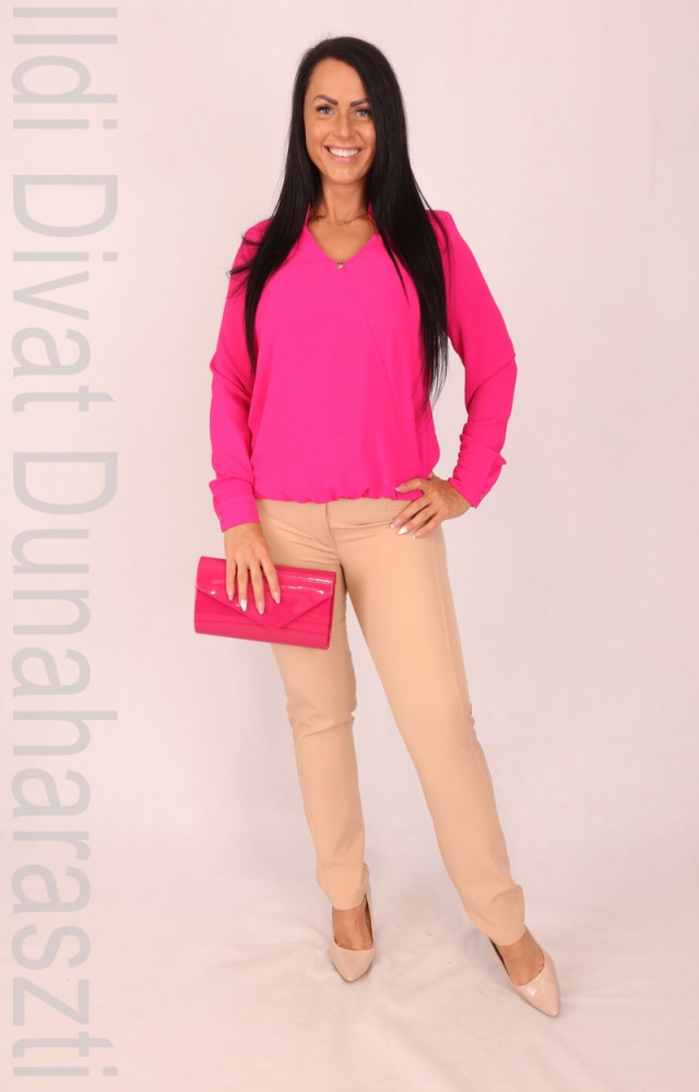 Mystic Day pink színű, V-kivágott és álló nyakú, elején gumírozott, lezser fazonú blúz.