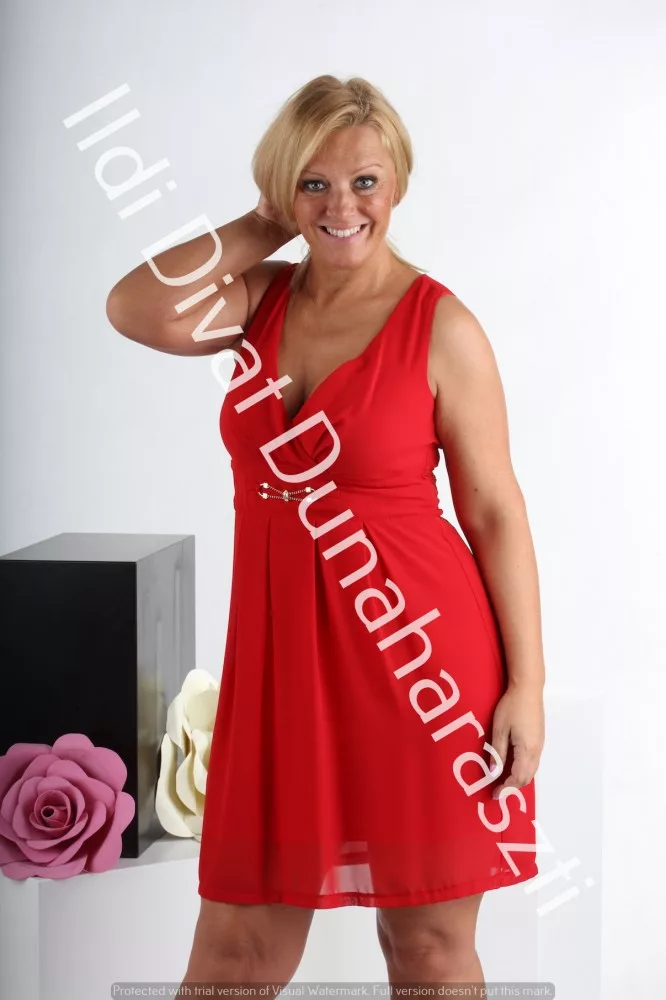 Mystic Day piros színű, muszlinos anyagú, derekán kötős, V-kivágott, A-vonalú ruha.