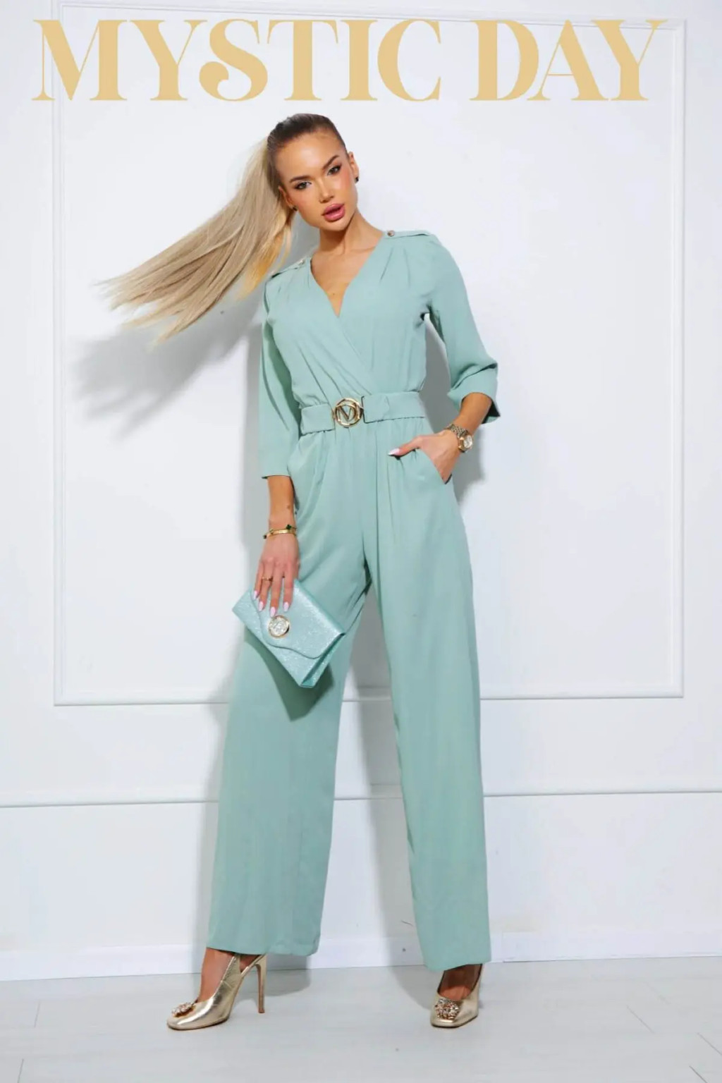 Mystic Day menta alapon V nyakú rövid ujjú egyenes szárú derekán öves overál.