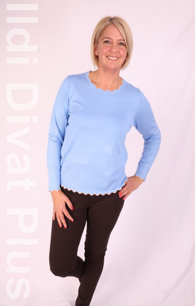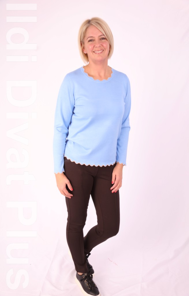 Micha kék alpon barna cakkos szélű hosszú ujjú kötött felső.