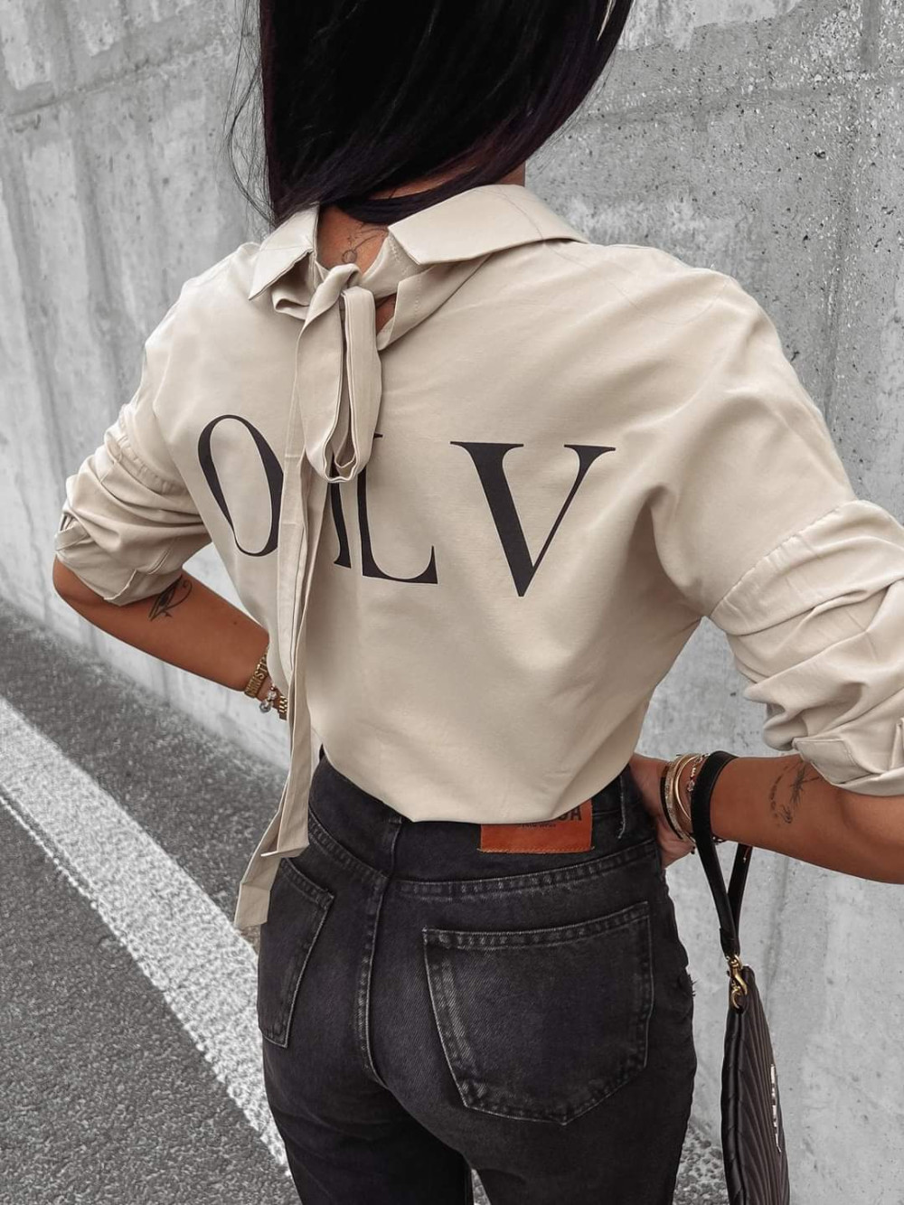 O'la Voga homok színű, galléros, mell részén féloldalt zsebes és feliratos, hát részén fekete feliratos és megkötős, egyenes fazonú ing.