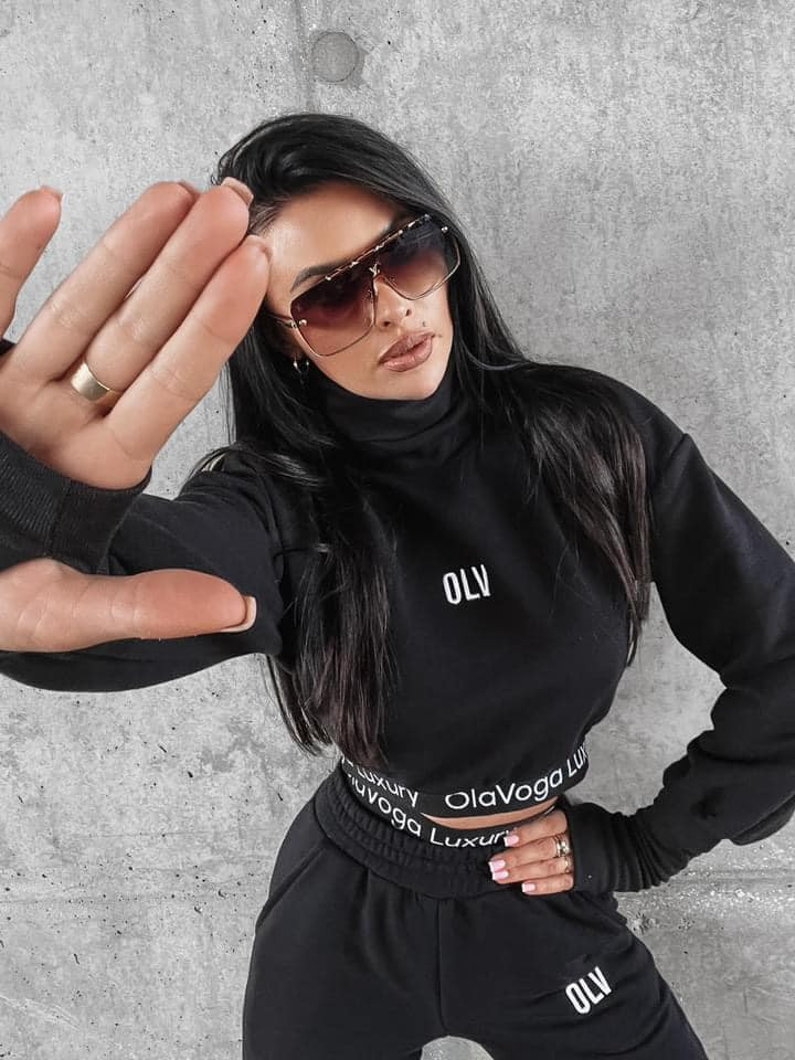 O'la Voga fekete-fehér színű, elején hímzett feliratos és, garbós nyakú, alján feliratos és gumírozott, ujja végén hosszított passzés, lezser és rövidített fazonú pulóver.