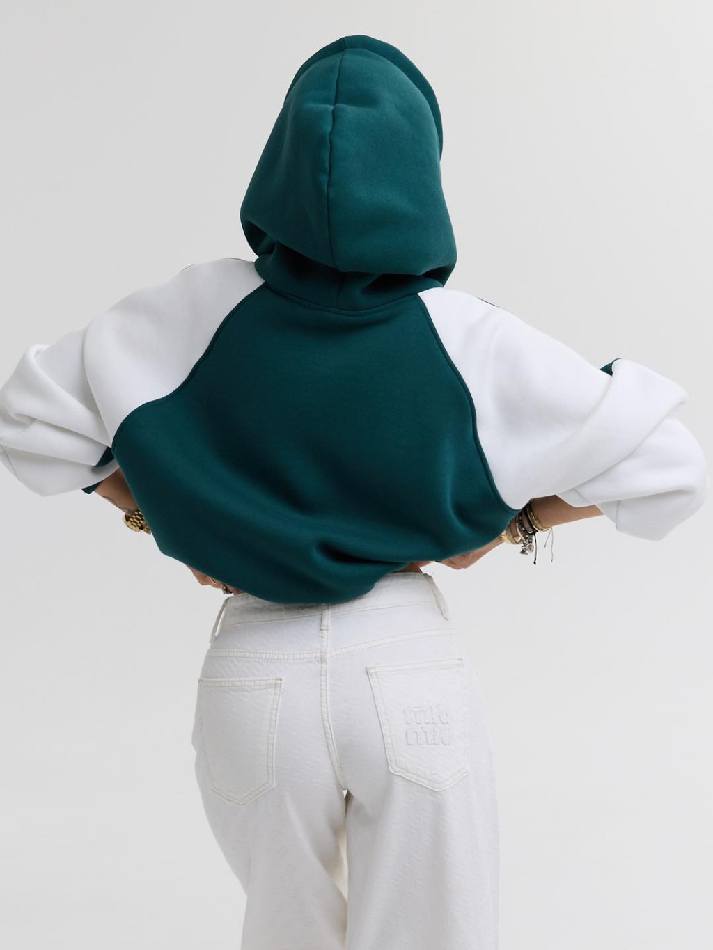 O'la Voga zöld-ekrü színű, elején filmnyomott, kapucnis, alján és ujja végén passzés, cipzáras, lezser fazonú pulóver.
