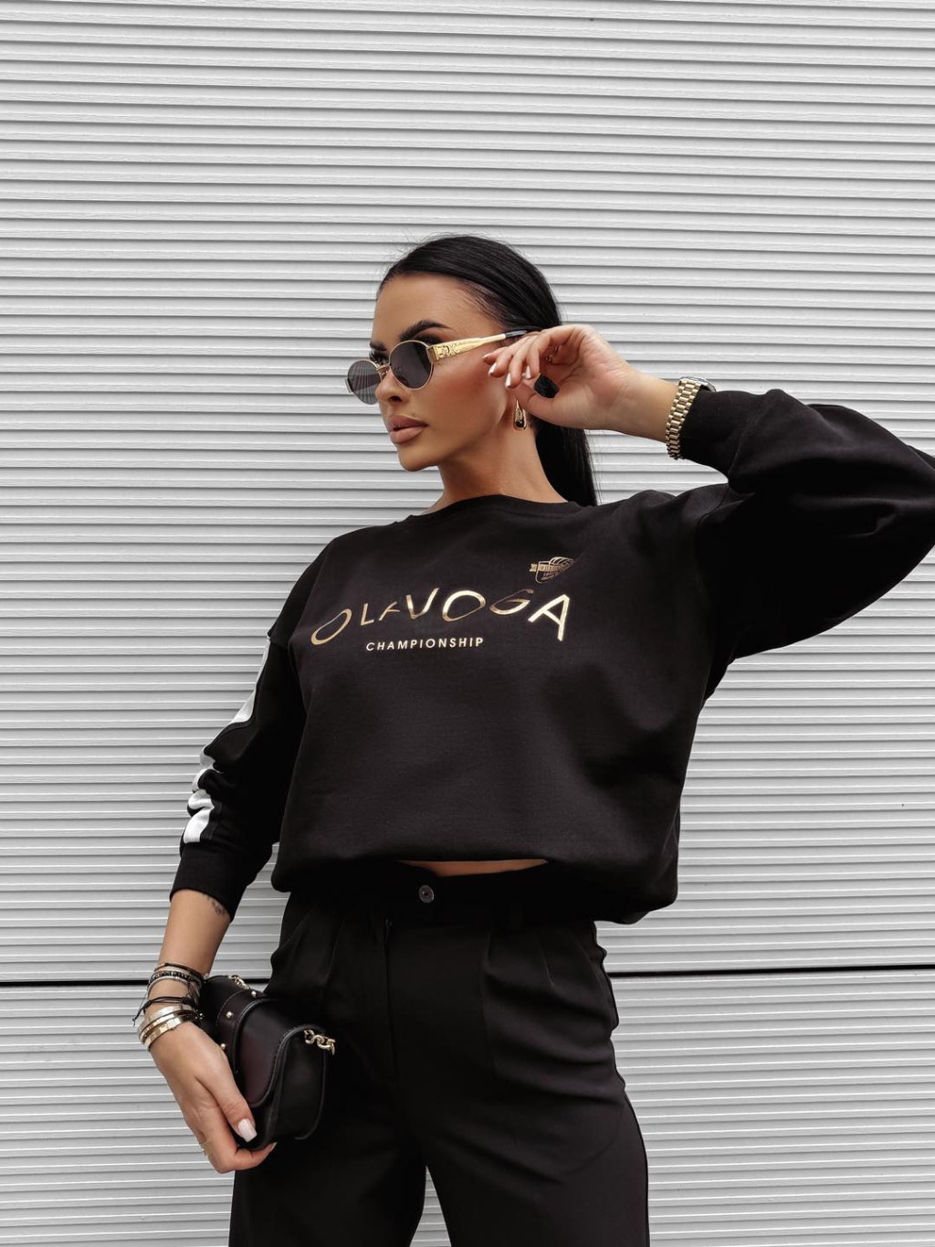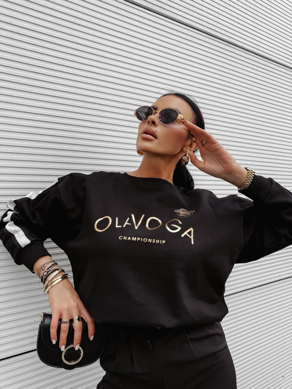 O'la Voga fekete színű, ujján fehér betétes, elején filmnyomott, alján és ujja végén passzés, lezser fazonú pulóver.