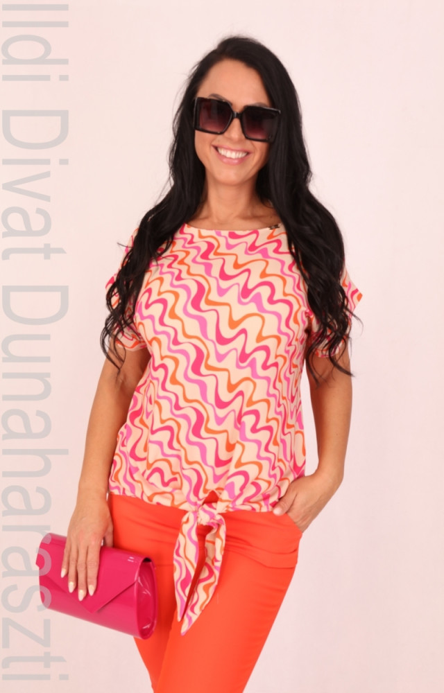 Rouge Avenue beige alapon narancs-pink hullám mintás, elején kötős, lezser fazonú felső.