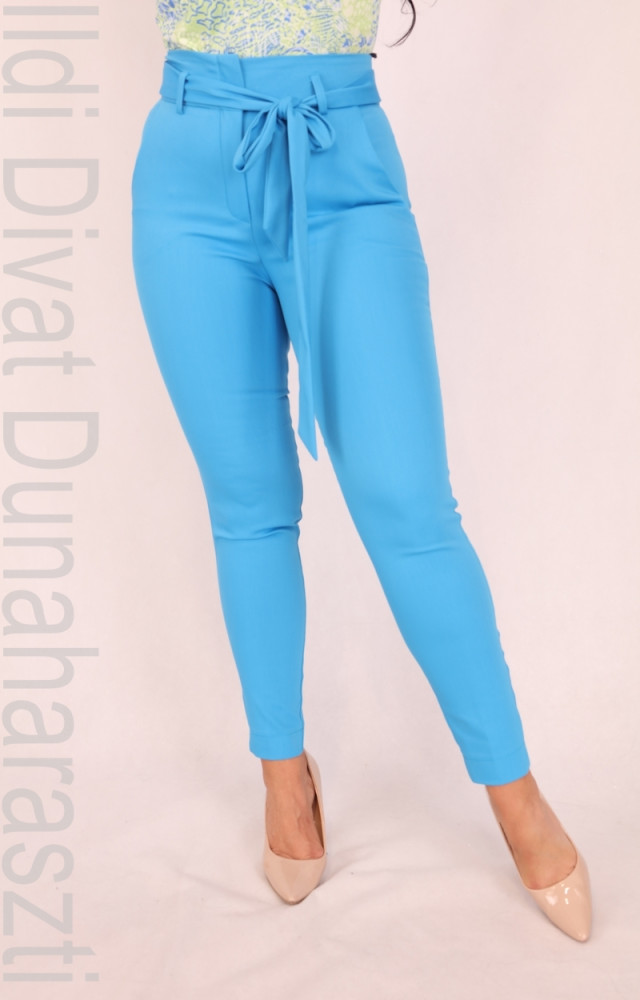 Rouge Avenue kék színű, élére vasalt, zsebes, hátul díszzsebes, derekán kötős, magasított derekú, elegáns nadrág.
