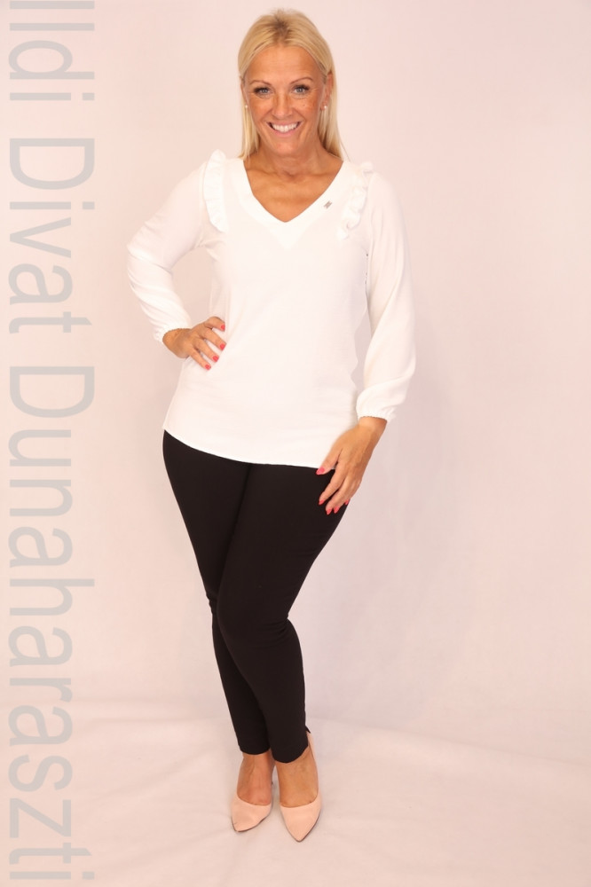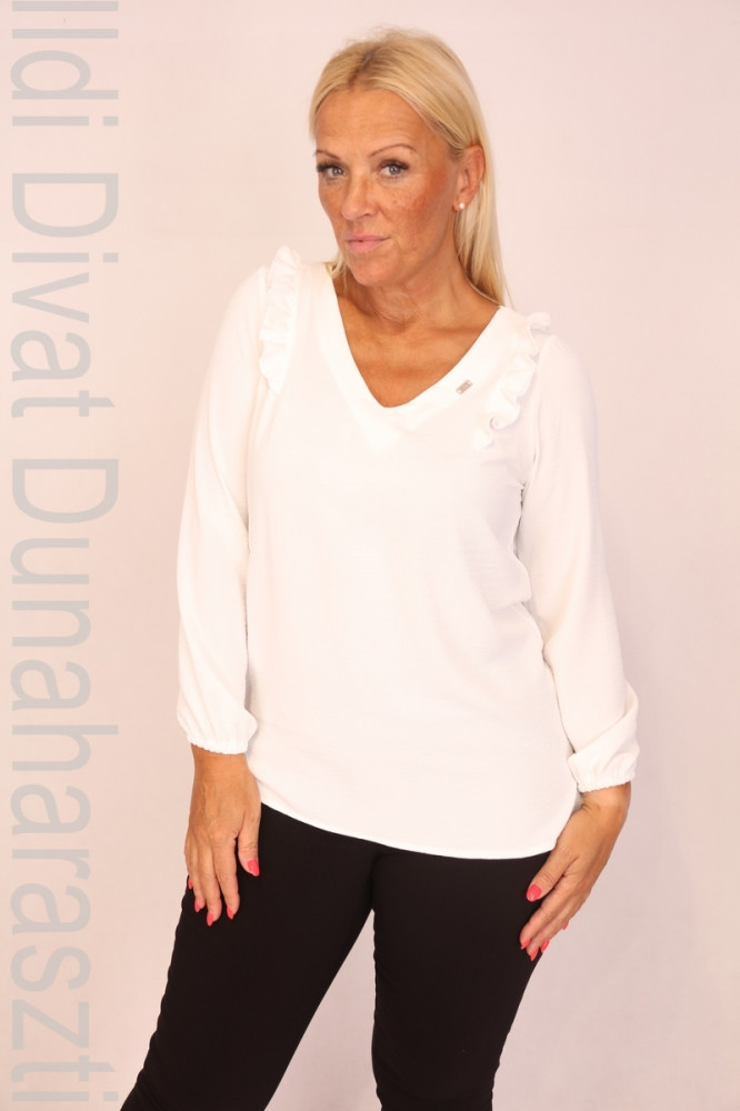 Tara Collection ekrü színű, V-kivágott, váll résznél fodor díszített, ujj végén gumírozott, egyenes fazonú, lenge blúz.