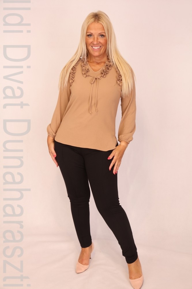 Viktori barna színű, V-kivágott, nyak és váll résznél fodor díszített, ujj végén gumírozott, egyenes fazonú, lenge blúz.