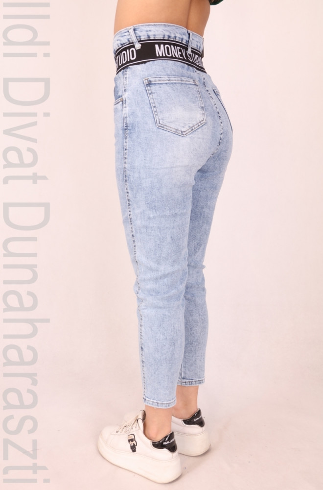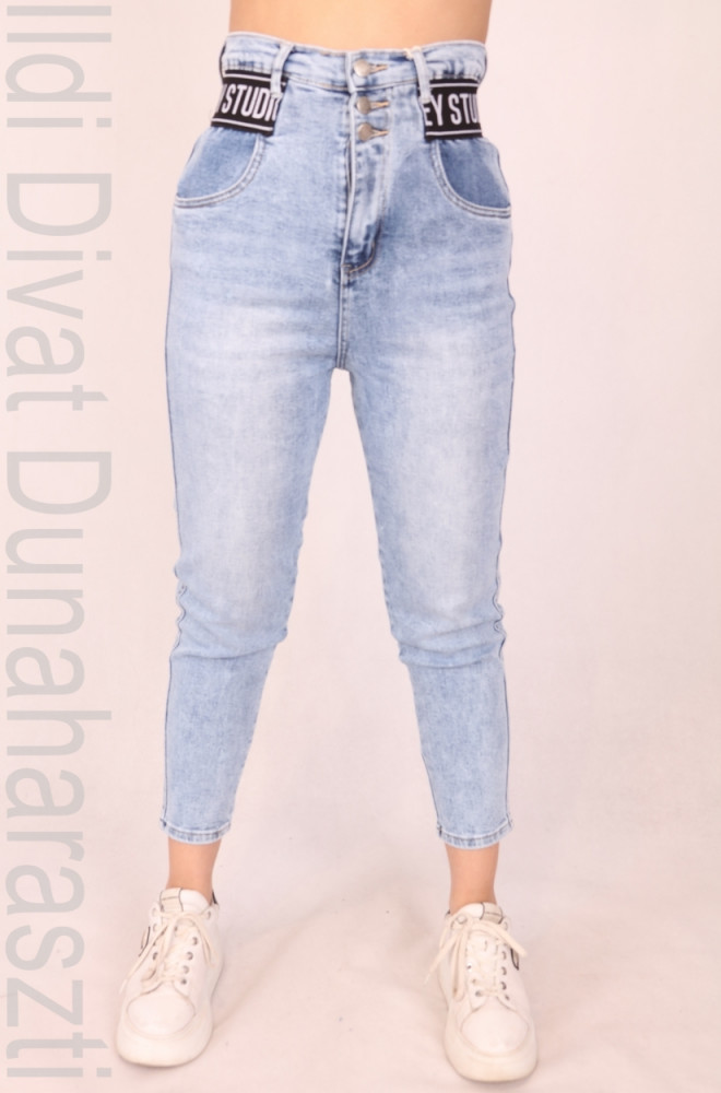 M.Sara farmerkék színű, elején és hátulján zsebes, derék részén gumírozott, 3 gombos, mom fit fazonú farmernadrág.