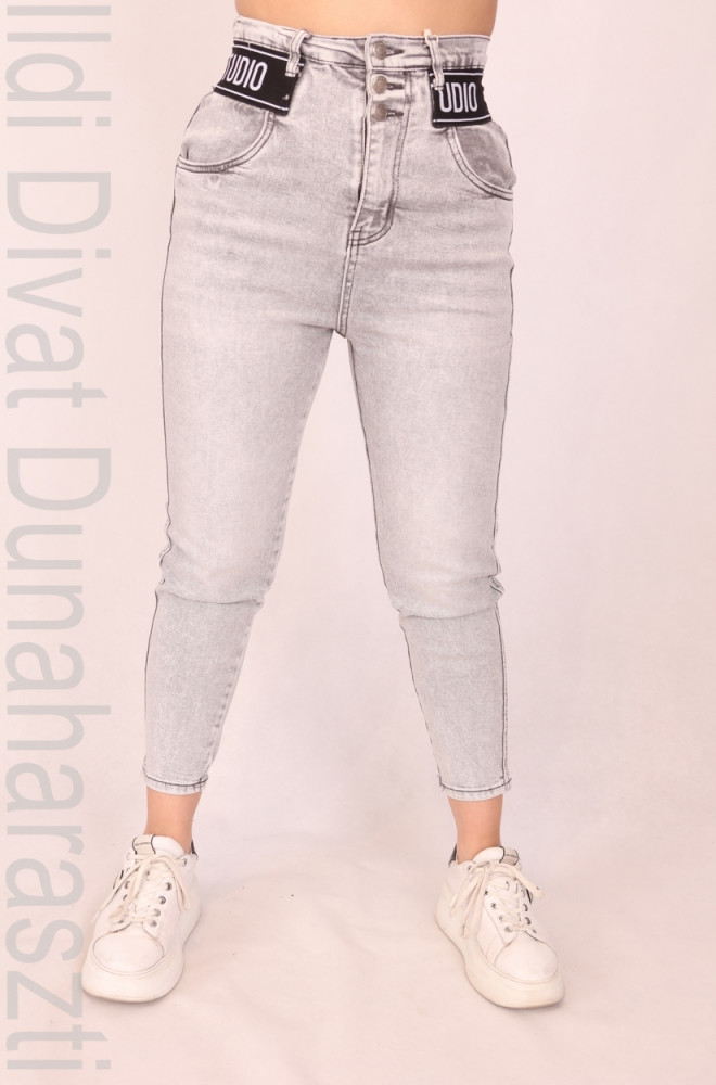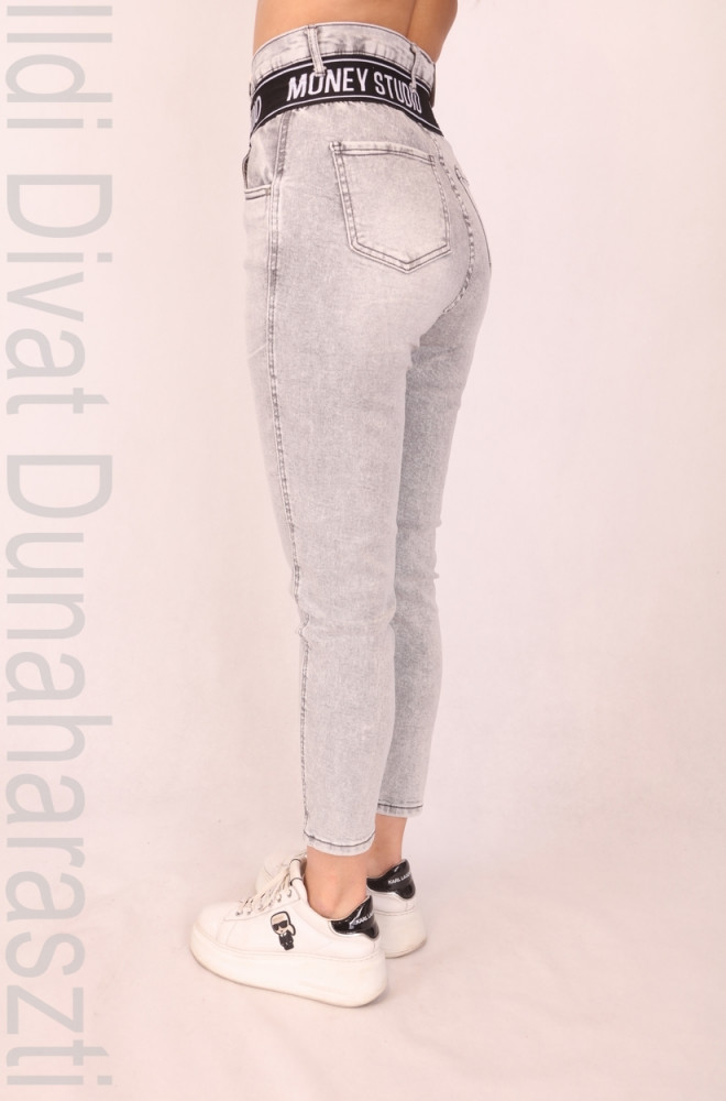 M.Sara szürke színű, elején és hátulján zsebes, derék részén gumírozott, 3 gombos, mom fit fazonú farmernadrág.