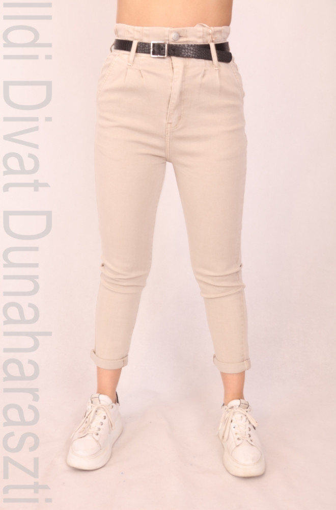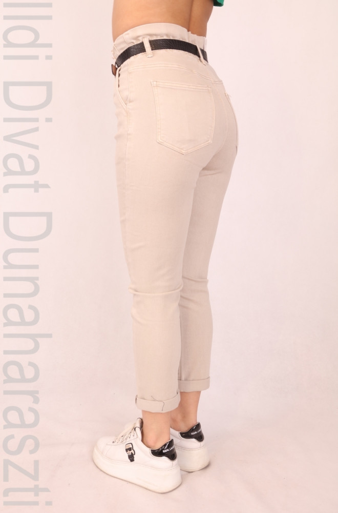 M.Sara drapp színű, elején és hátulján zsebes, derék részén gumírozott és öves, 2 gombos, mom fit fazonú farmernadrág.