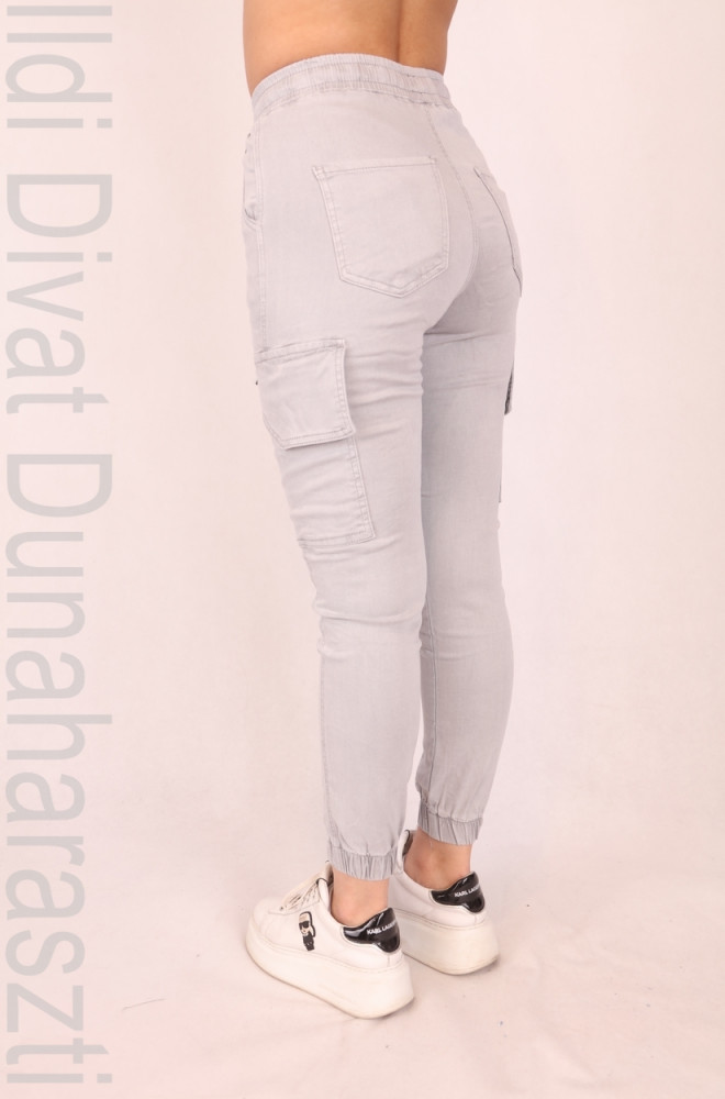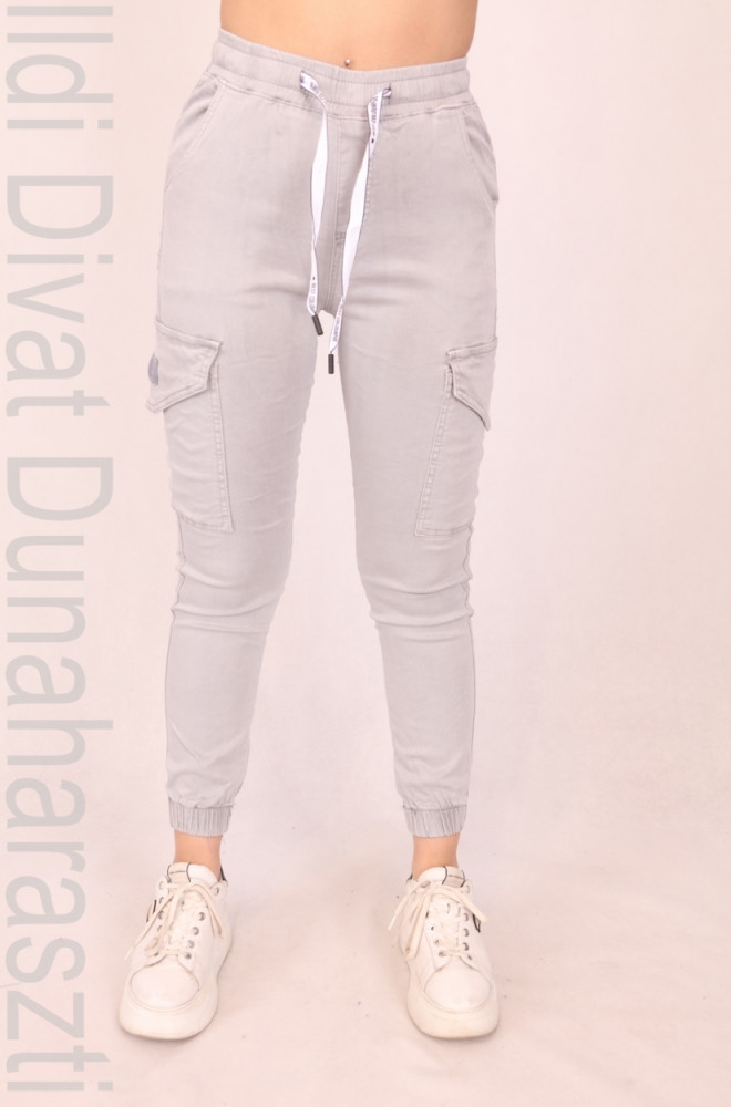 M.Sara szürke színű, elején, oldalán és hátulján zsebes, derék részén gumírozott és megkötős, alján gumírozott, lezser fazonú nadrág.