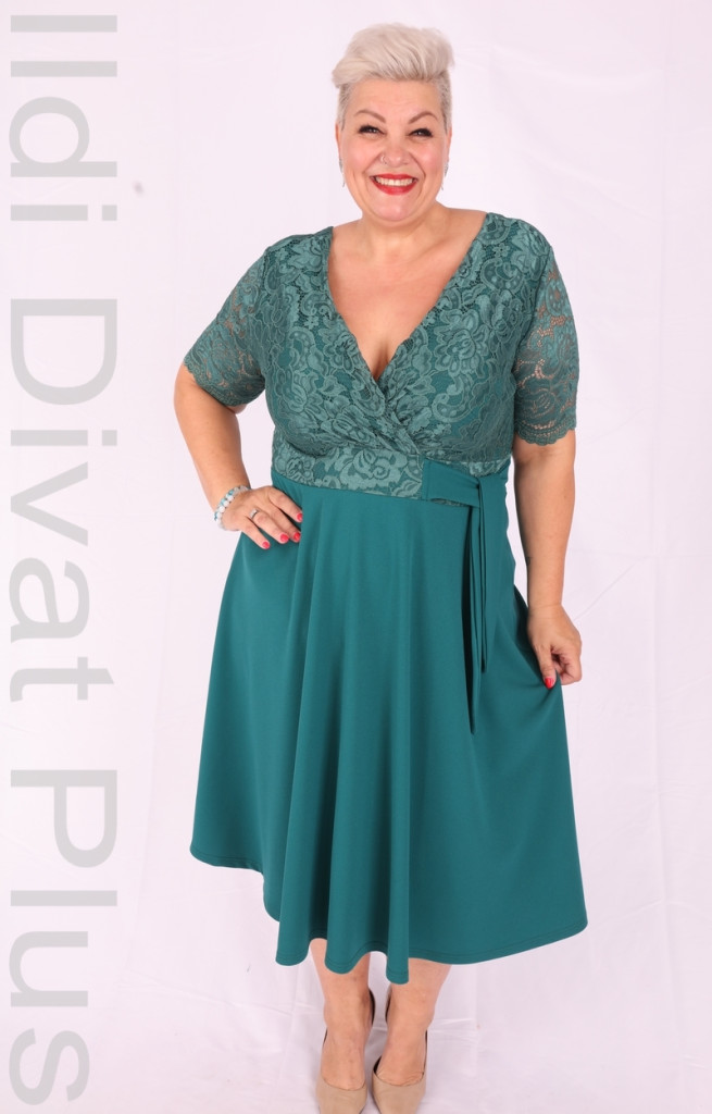 Zita smaragd-zöld színű, V-kivágott, mell részén csipkés és átlapolt, derék részén megkötős, A-vonalú ruha.