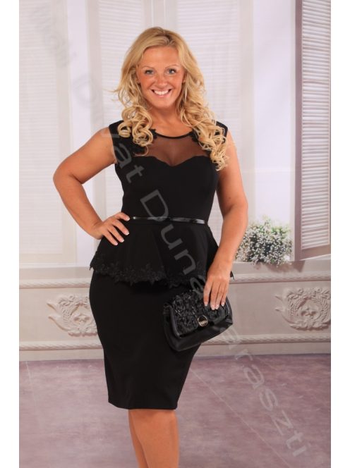 Fervente fekete színű, necc és csipke betétes, derekán öves és fodor díszítéses, karcsúsított fazonú ruha.