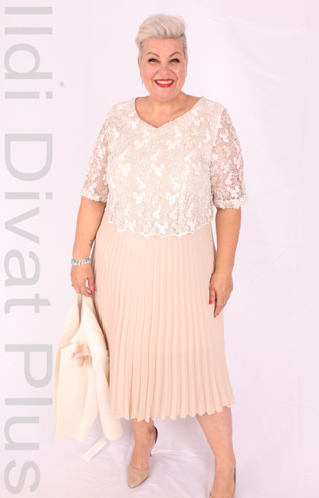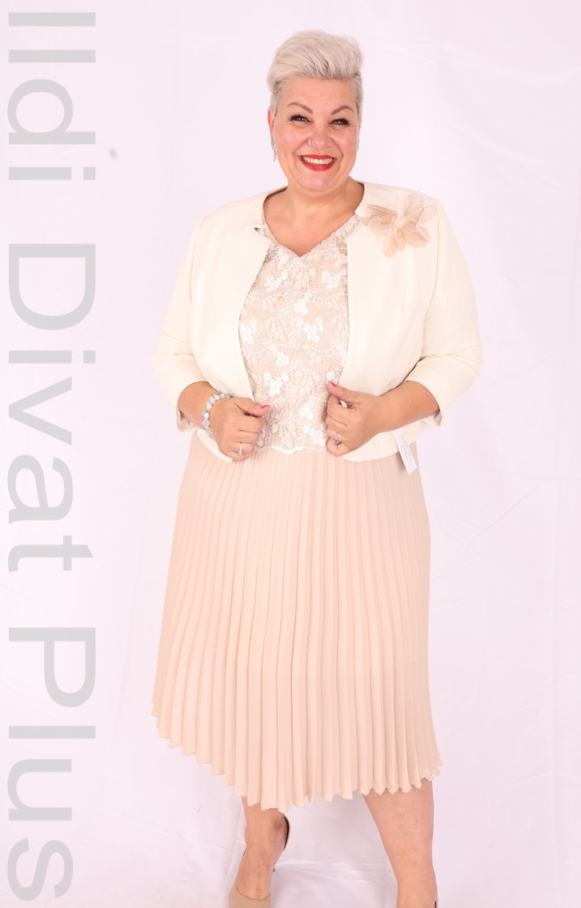 Arany-beige csipkés felső részén csillogós alján pliszírozott szoknyás ruha+ blézer