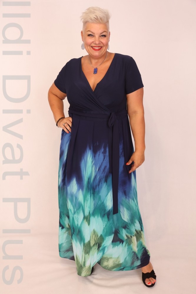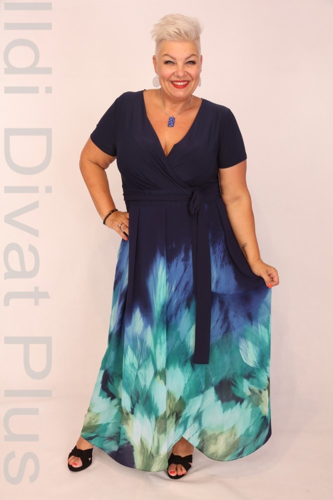 Gabriella menta-zöld-sötétkék színű, V-kivágott, mell részén átlapolt és húzott, derék részén megkötős, lefelé bővülő fazonú ruha.
