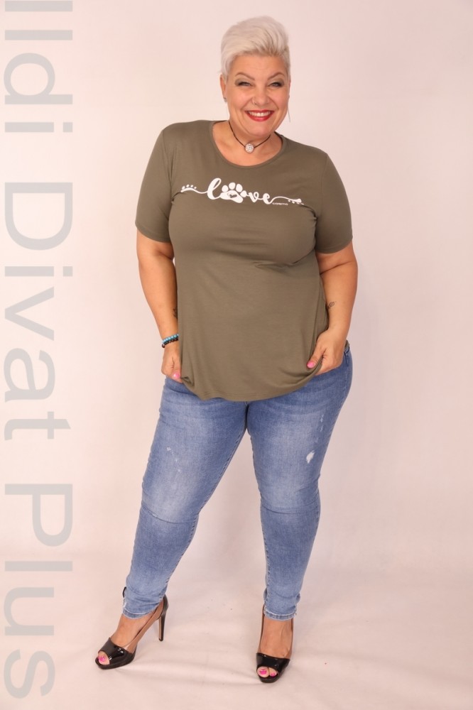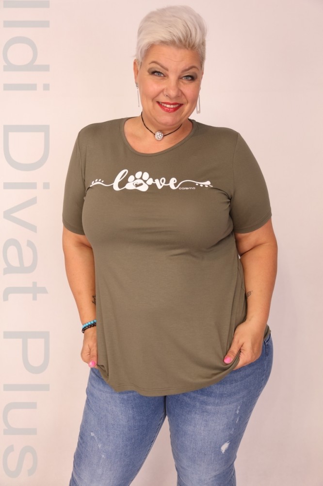 Caremo keki színű, kerek nyakú, elején filmnyomott, karcsúsított fazonú felső.