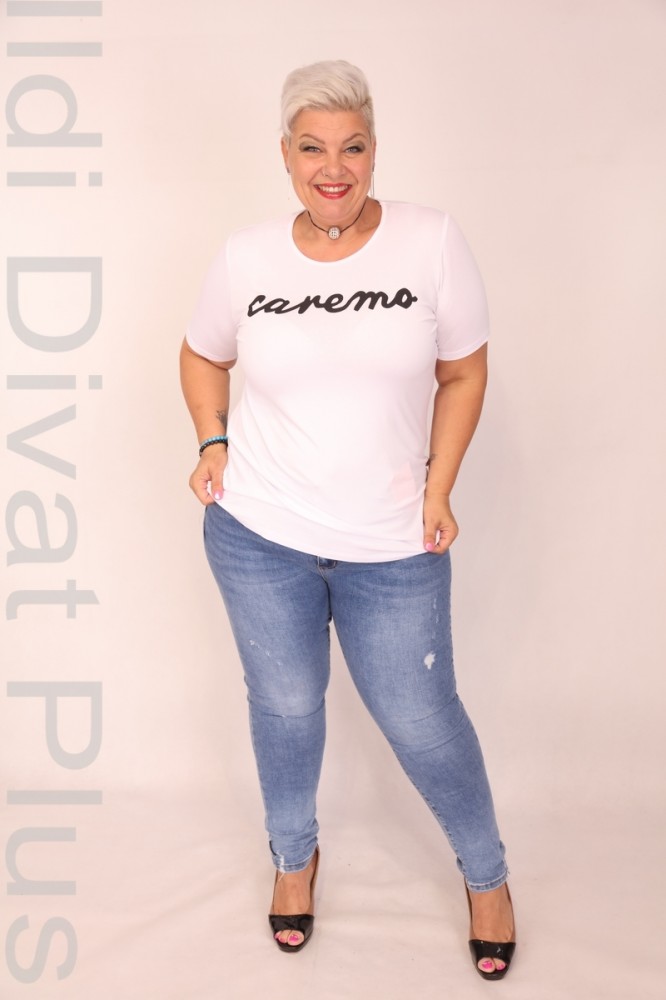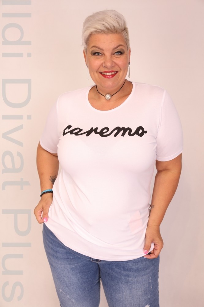 Caremo fehér színű, kerek nyakú, elején filmnyomott, karcsúsított fazonú felső.