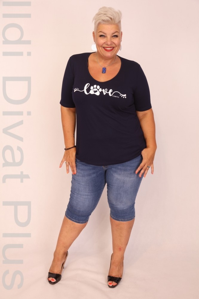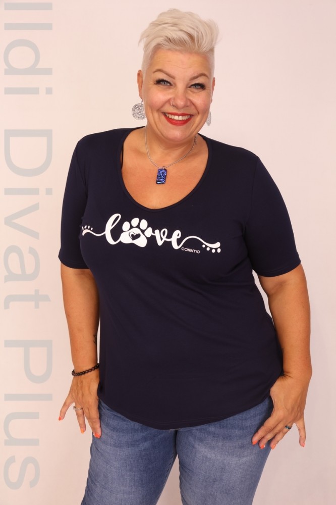 Caremo sötétkék színű, V-nyakú, elején filmnyomott, karcsúsított fazonú felső.