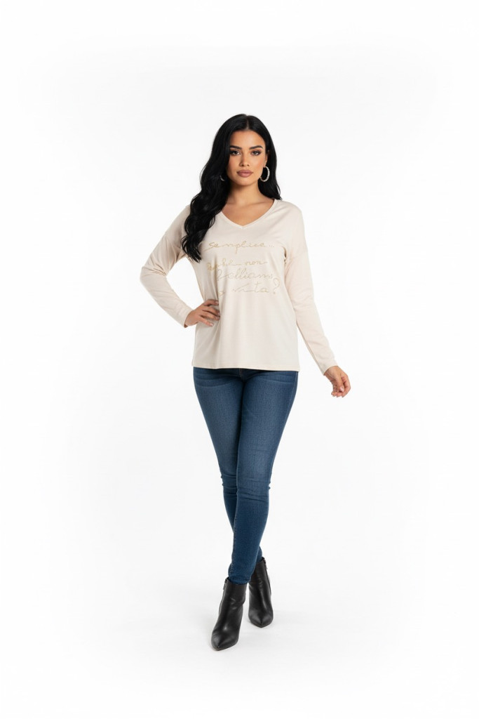 Elisa Cavaletti beige alapon köves hosszú ujjú felső.