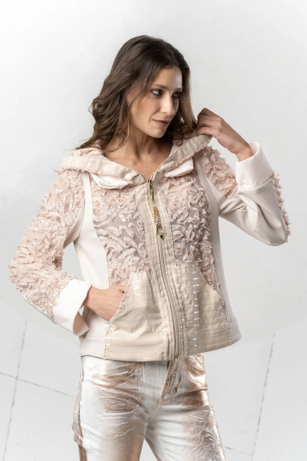 Elisa Cavaletti púder alapon csipkés flitteres ,kapucnis kardigán.