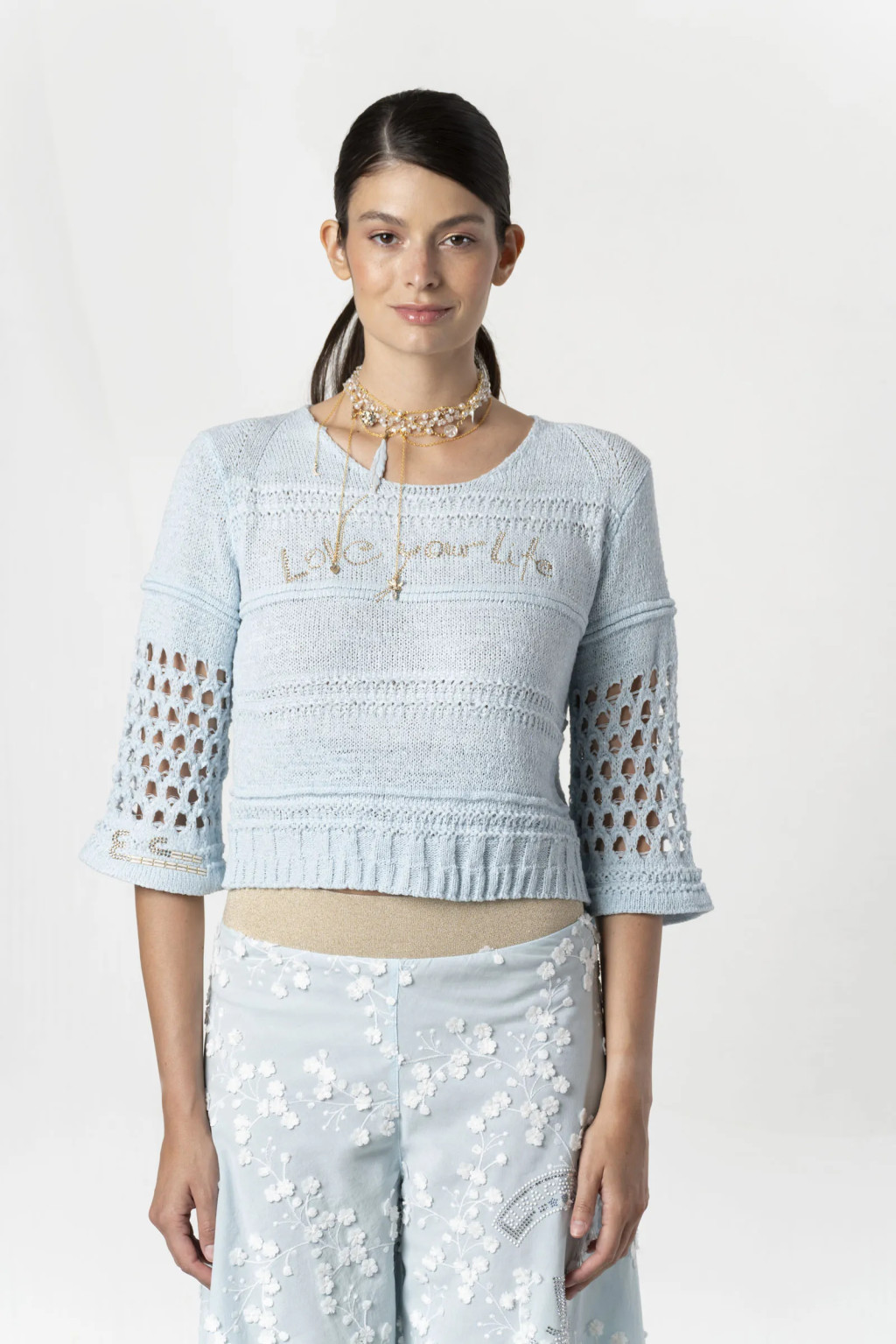 Elisa Cavaletti babakék alapon elején köves horgolt felső.