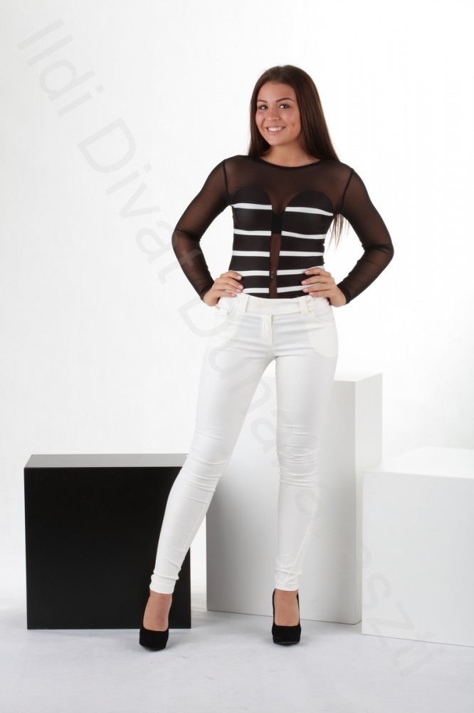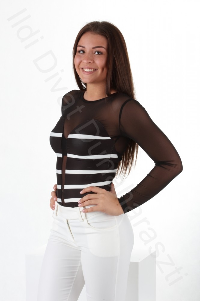 Envy Fashion fekete-fehér színű, elején necc betétes, hátán teljes áttetsző necces anyagú, karcsúsított fazonú body.