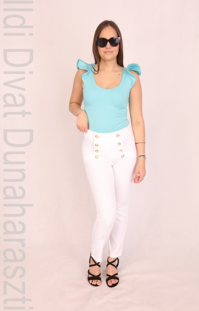 Envy Fashion vízkék színű, dekoltált, fodros vállú, karcsúsított fazonú body.