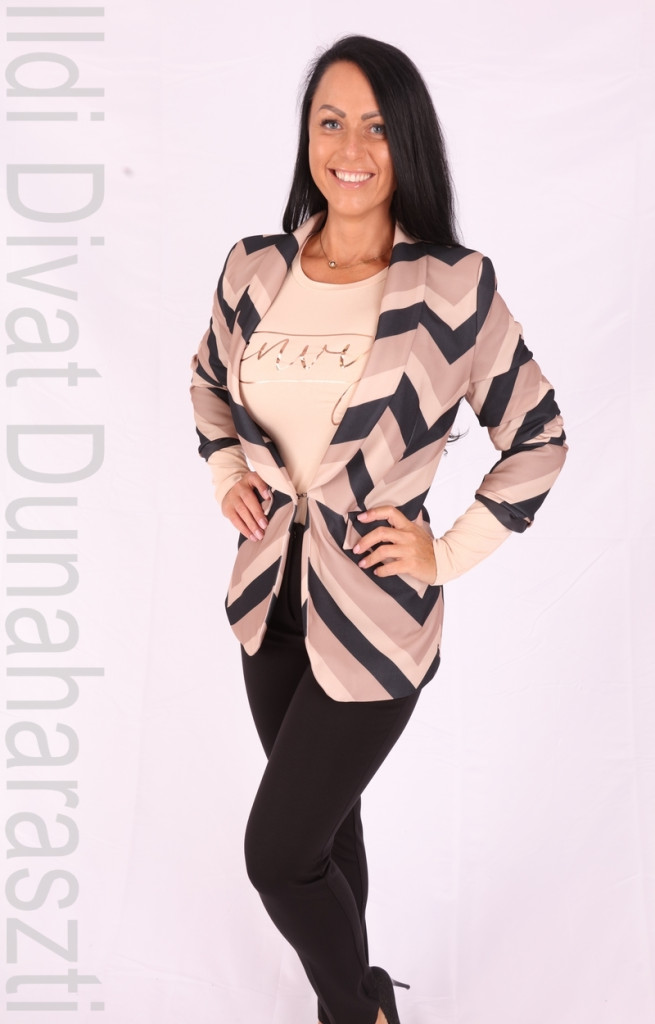 Envy Fashion fekete-barna-bézs csíkos, galléros, zsebes, ujján húzott, elején francia kapcsos, hosszított fazonú blézer.