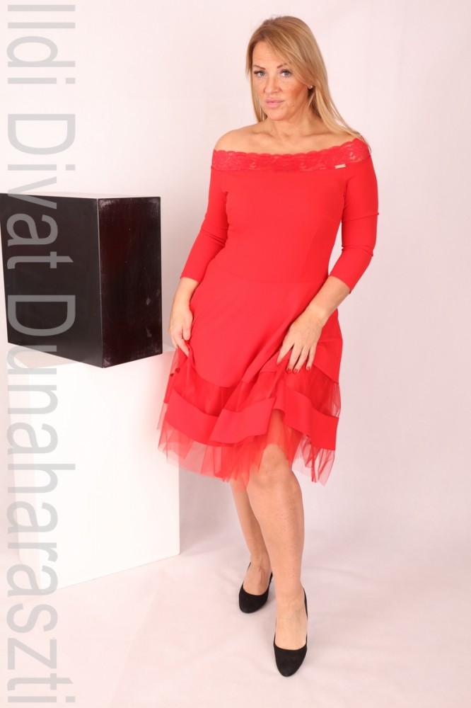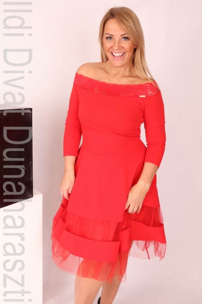 Mystic Day piros színű, tüllös aljú, vállra húzható, A-vonalú ruha.