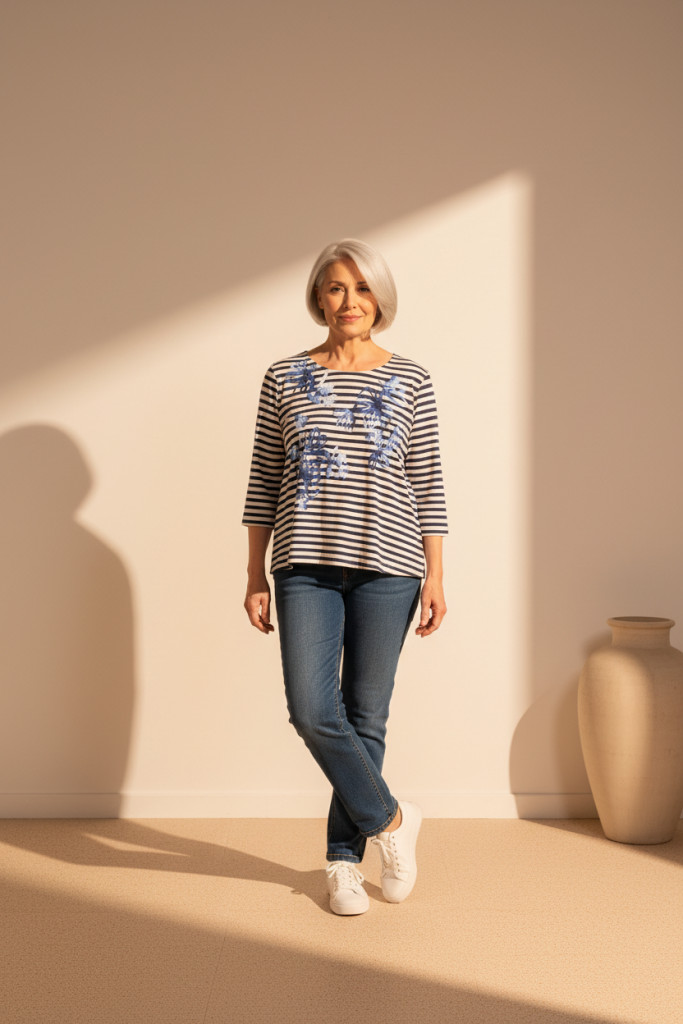 Olsen fehér alapon kék csíkos virágmintás köves felső.