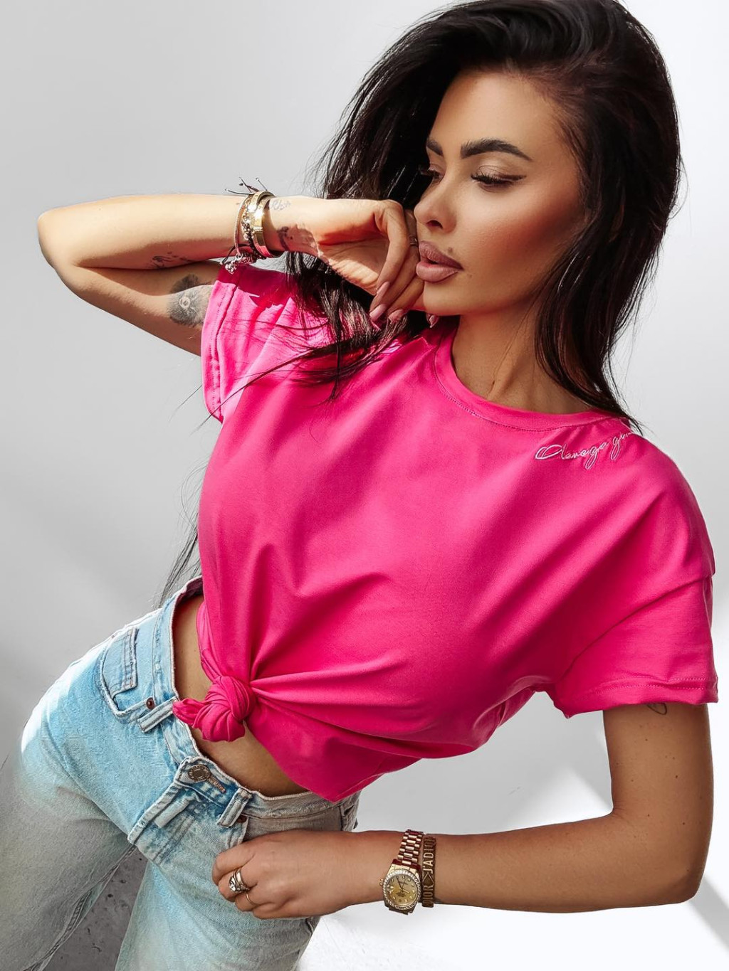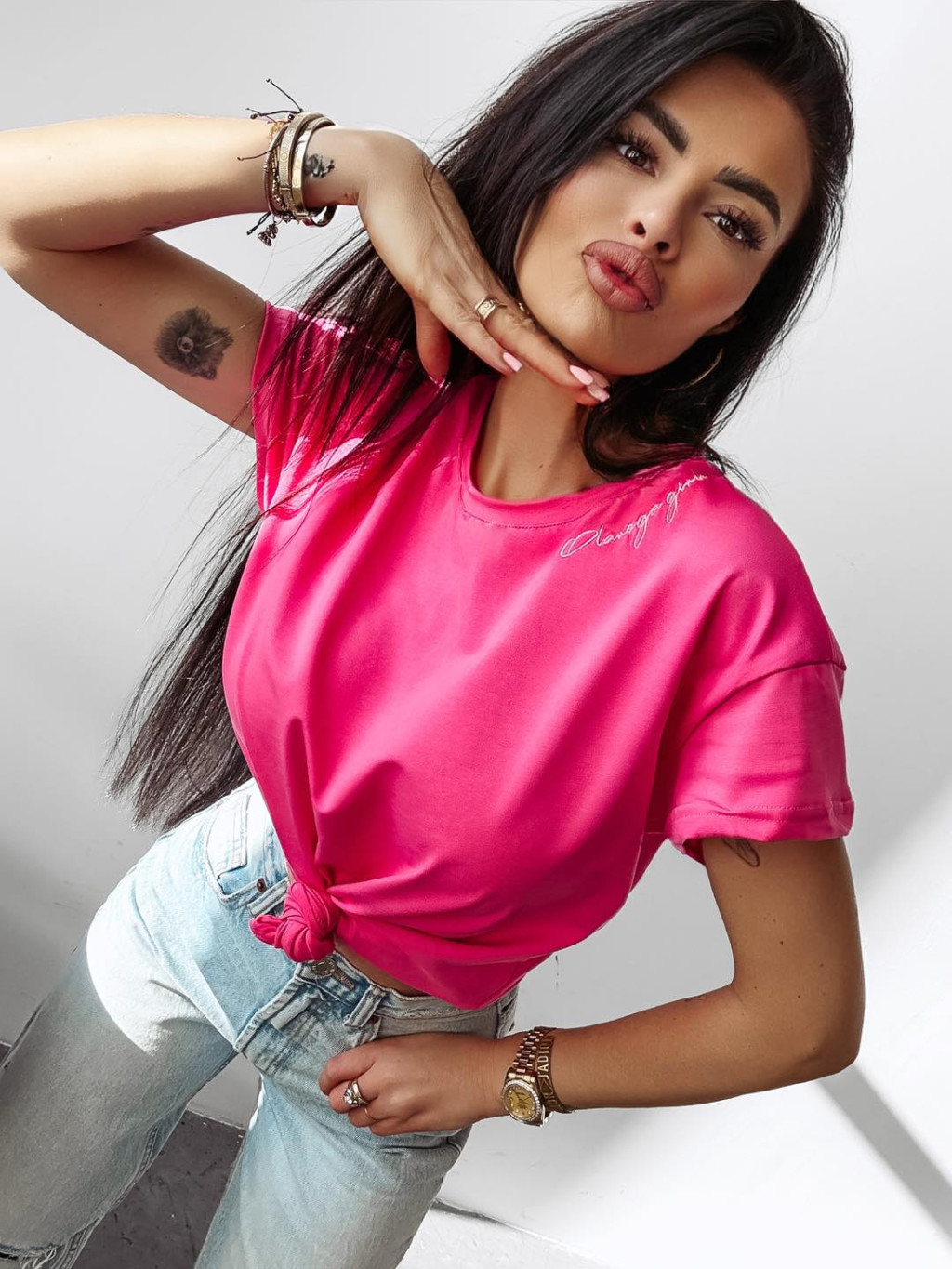 O'la Voga pink színű, elején hímzett feliratos, egyenes fazonú felső.