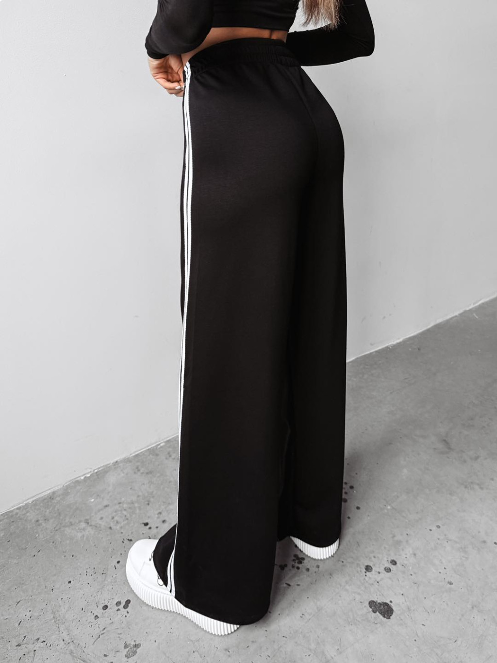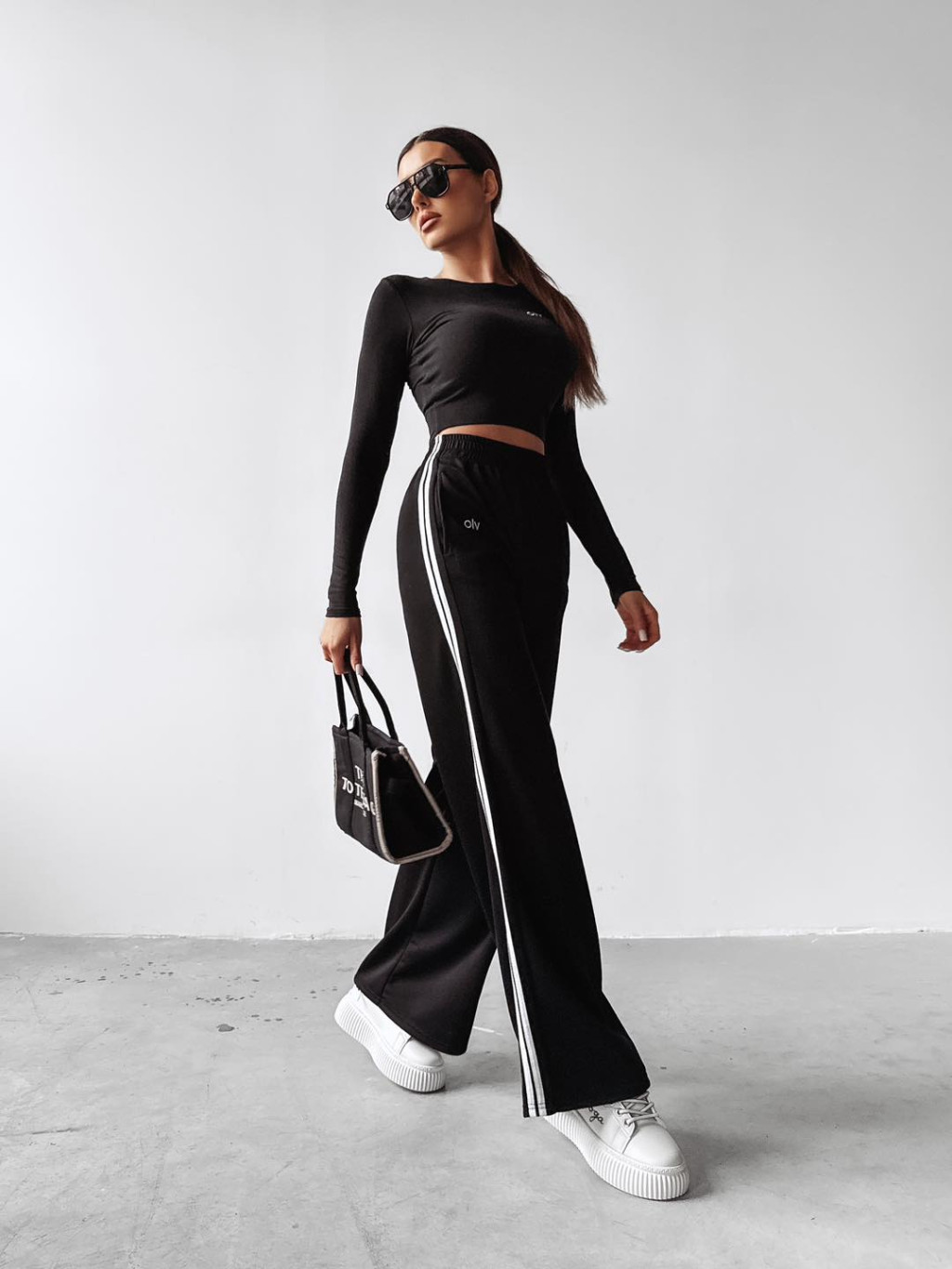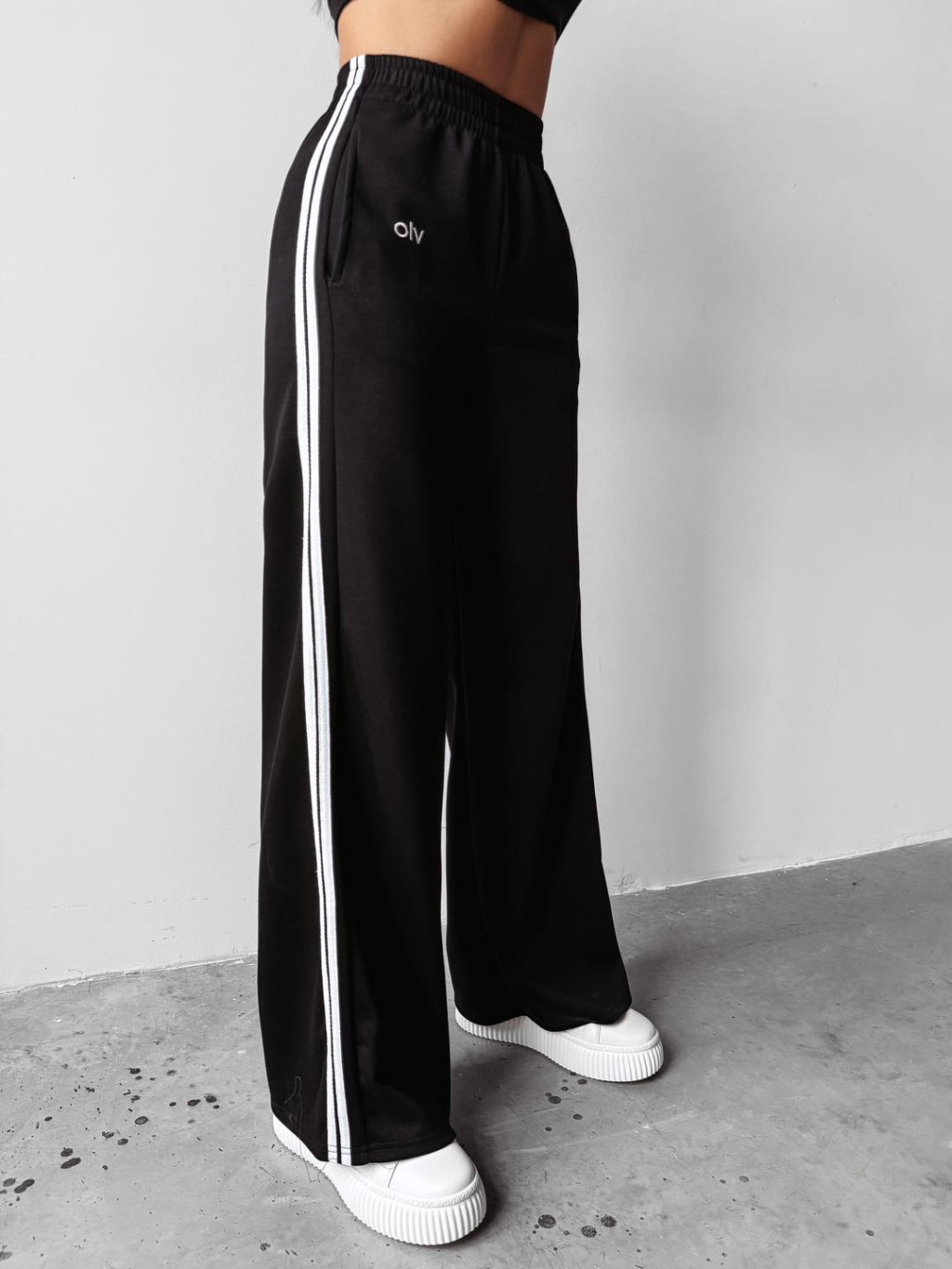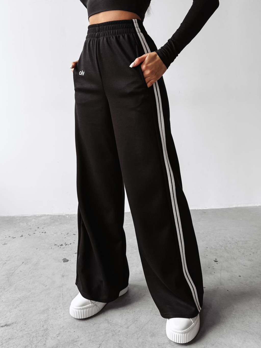O'la Voga fekete színű, fehér csíkos betétes, elején hímzett feliratos, zsebes, bőszárú nadrág.