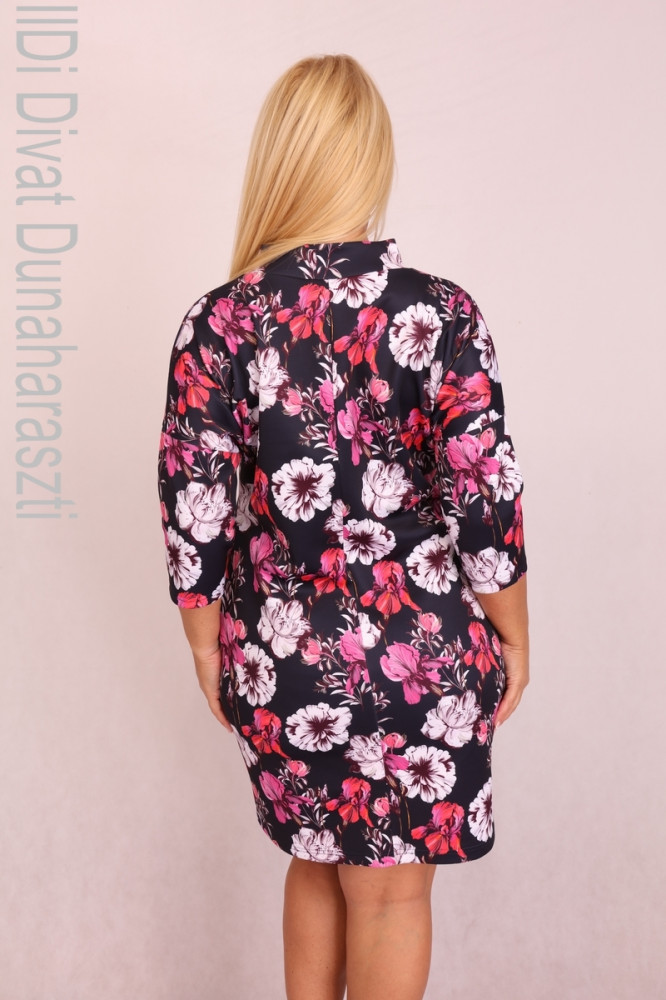 Rouge Avenue sötétkék alapon virágmintás, álló nyakú, mell részén arany cipzárral díszített, egyenes fazonú ruha.