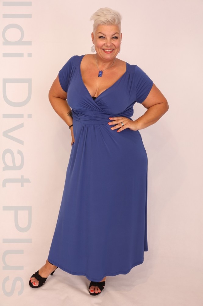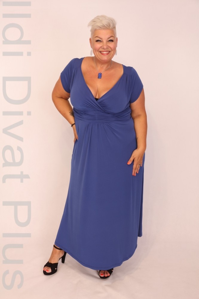 Zita királykék színű, V-kivágott, mell részén átlapolt és húzott, lefelé bővülő fazonú maxi ruha.