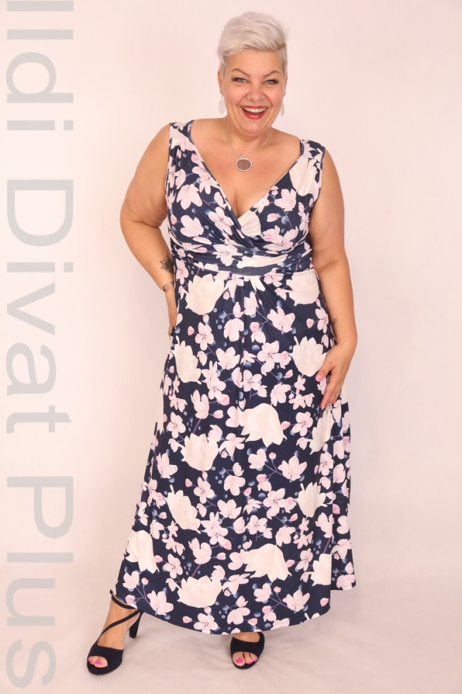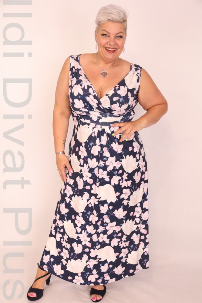 Zita kék-rózsaszín virágmintás, V-kivágott, mell részén átlapolt és húzott, ujjatlan, lefelé bővülő fazonú maxi ruha.