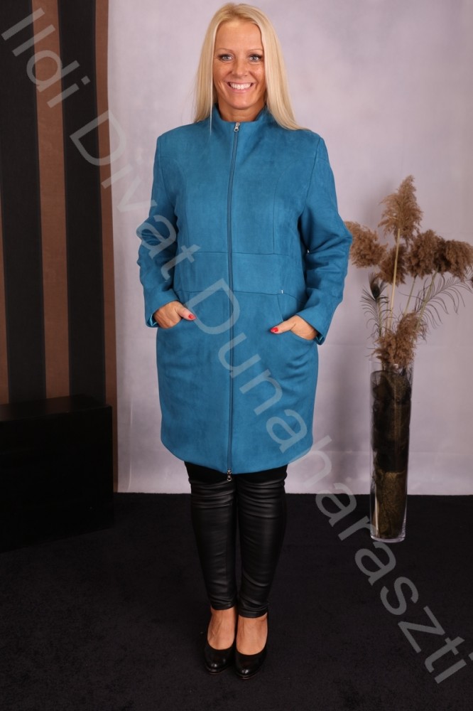 Mystic Day petrol színű kabát, velúr műbőr anyagú, álló nyakú zsebes, egyenes fazonú kabát.