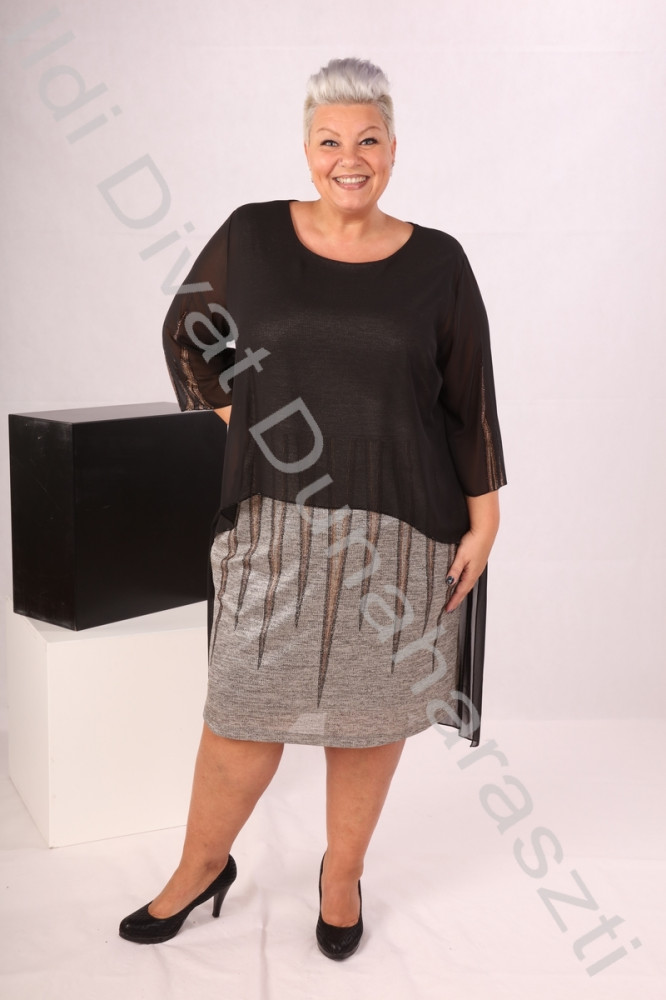 Belerina arany-fekete színű, kerek nyakú, muszlinos anyagú, felül lezser fazonú, alul egyenes fazonú ruha.