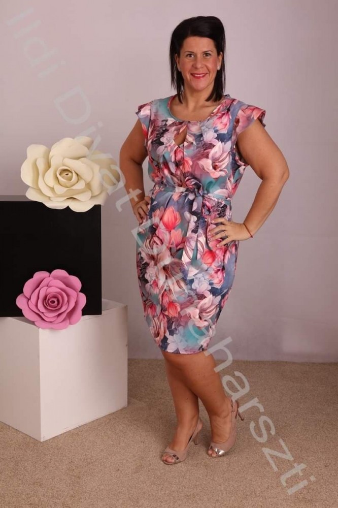 Crafty Clothes színes virágmintás, kerek nyakú, csepp kivágott, derék részén kötős, egyenes fazonú ruha.
