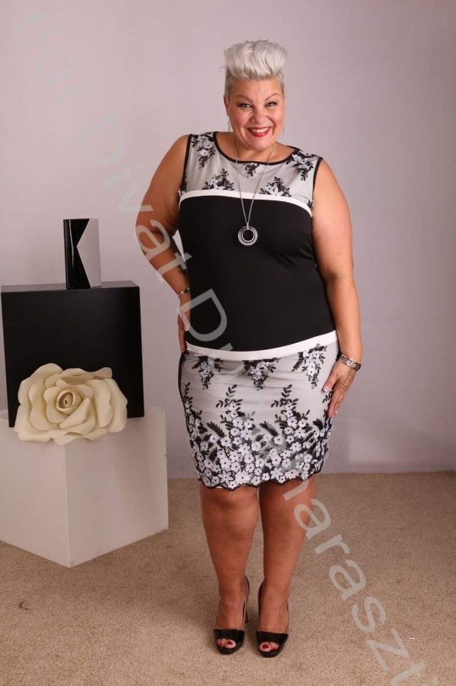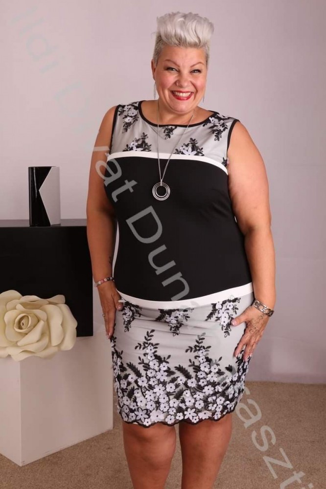 Crafty Clothes fehér-fekete színű, virágmintával díszített, karcsúsított fazonú ruha.