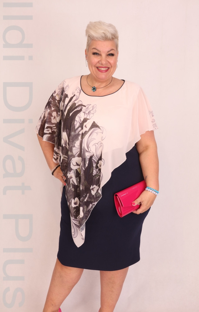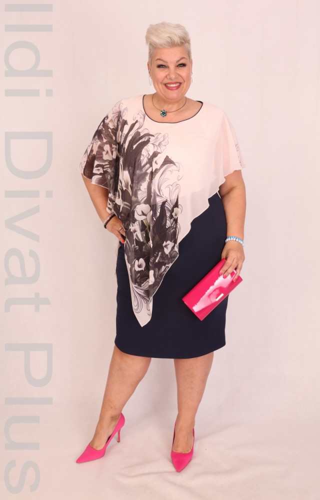 Botega Elena kék-púder virágmintás, felül muszlin rátétes, alul karcsúsított fazonú ruha.