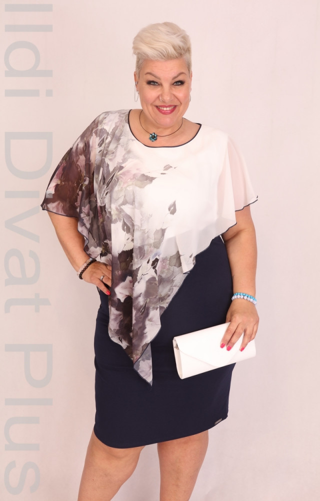 Botega Elena kék-lila virágmintás, felül muszlin rátétes, alul karcsúsított fazonú ruha.
